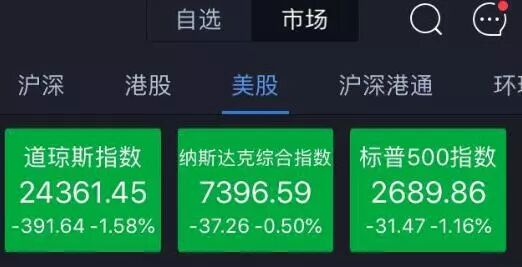 当地时间周二美股大幅收跌。标普500指数收跌31.47点,跌幅1.16%,创4月24日以来最大单日跌幅,报2689.86点。道琼斯工业平均指数收跌391.64点,跌幅1.58%,也创4月24日以来最大单日跌幅,报24361.45点。纳斯达克综合指数收跌37.26点,跌幅0.50%,报7396.59点。