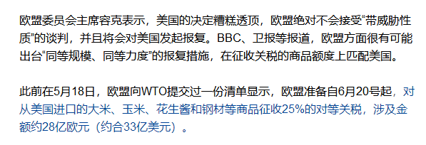 据BBC报道,欧盟官员在布鲁塞尔表示,下一步将考虑“以牙还牙”的对等报复(react in kind);墨西哥经济部也制定了同等规模报复举措。