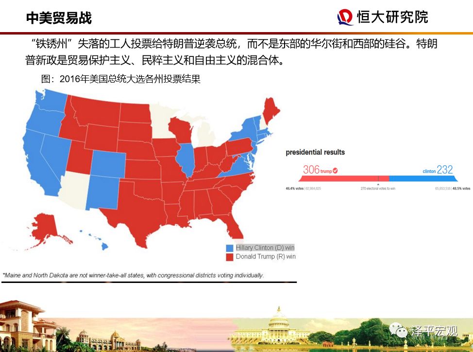 “铁锈州”失落的工人投票给特朗普逆袭总统,而不是东部的华尔街和西部的硅谷。大选期间特朗普的政策主张是贸易保护主义、民粹主义和自由主义的混合体。胜选后特朗普政策框架核心开始明确细节并着手实施,比如签署税改法案、加快加息节奏、收紧移民政策、对中日欧全面开打贸易战等。