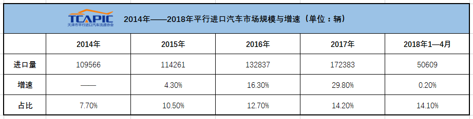 [秘书处报] 中国平行进口汽车进口量逐年上升,2017年进口172383辆,同比增长29.8%,占进口车总量已达到 14.2%。2018年1-4月累计进口量超过5万,达到50609辆,同比增长0.2%,占进口总量13.9%。主要由于关税下调预期,2018年3-4月平行进口汽车进口量出现下滑。