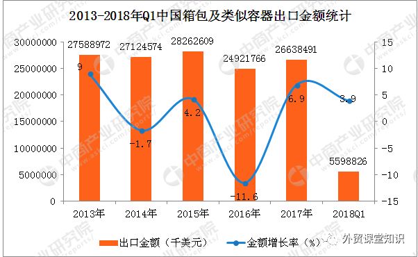 出口金额方面,2018年1-3月中国出口箱包及类似容器类55.99亿美元,同比增长3.9%。2013-2017年我国箱包及类似容器类出口金额整体表现比较平稳,五年年均复合增长率为-0.87%。