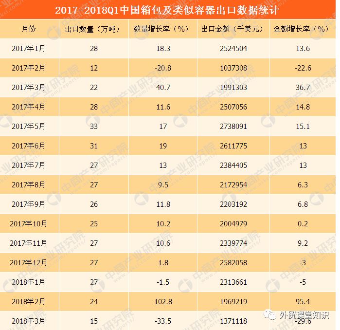 2017年-2018年中国箱包及类似容器出口情况一览表