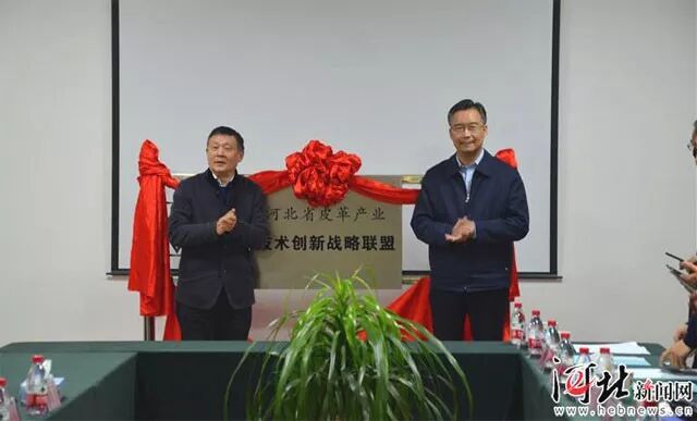 图为石碧院士与辛集市委书记王现坤共同为河北省皮革产业技术创新战略联盟揭牌。 记者任学光摄