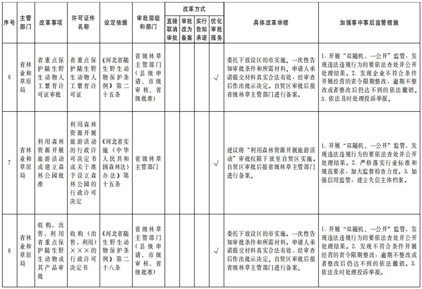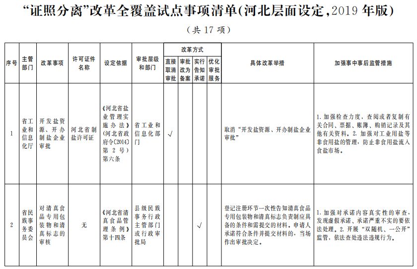 在河北层面设定的涉企经营许可事项中,修订《河北省盐业管理实施办法》;履行省人大常委会授权程序后,暂时调整实施《河北省清真食品管理条例》。各级各部门制定的规范性文件要作相应调整,建立与试点要求相适应的管理制度。司法行政部门要及时掌握改革的司法需求,组织推动地方性法规、政府规章和规范性文件的立改废,固化改革效果。