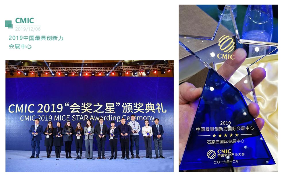 在6日下午进行的CMIC 2019“会奖之星”颁奖典礼上,石家庄国际会展中心荣获“2019中国最具创新力会展中心”行业大奖。
