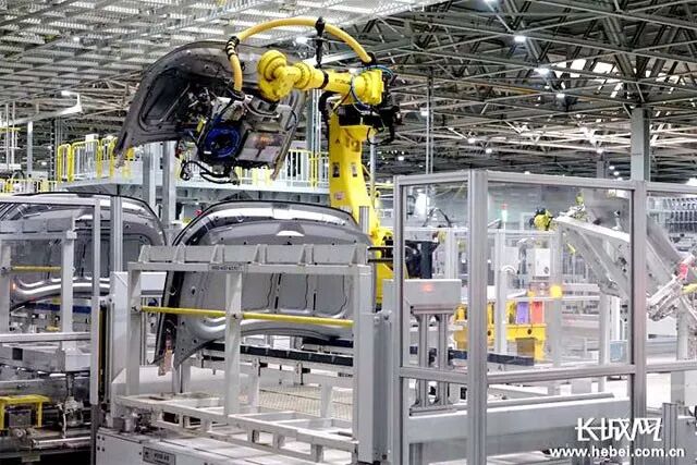 北京现代沧州工厂车间的机器人正在作业。