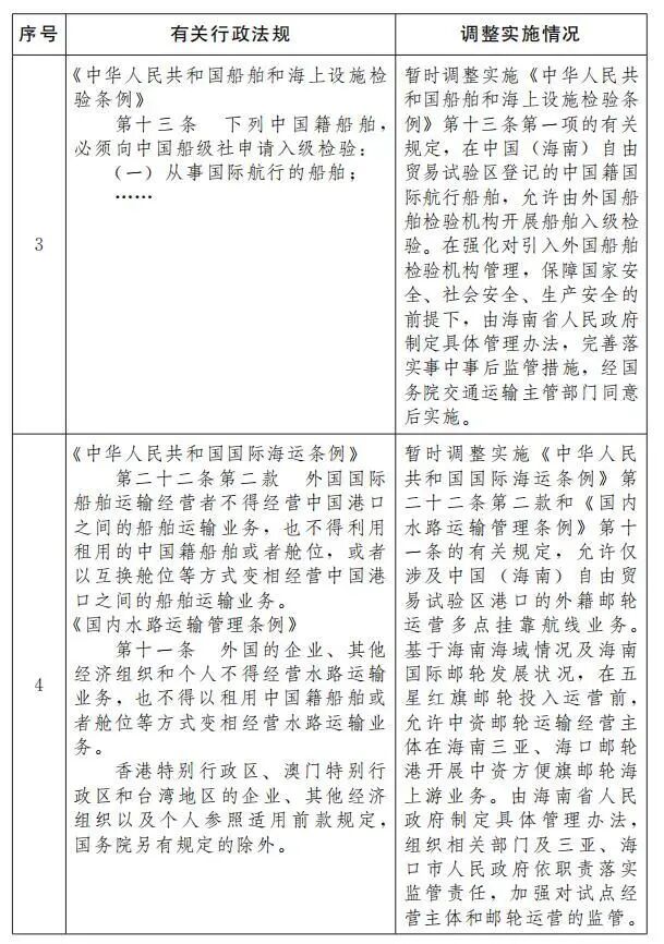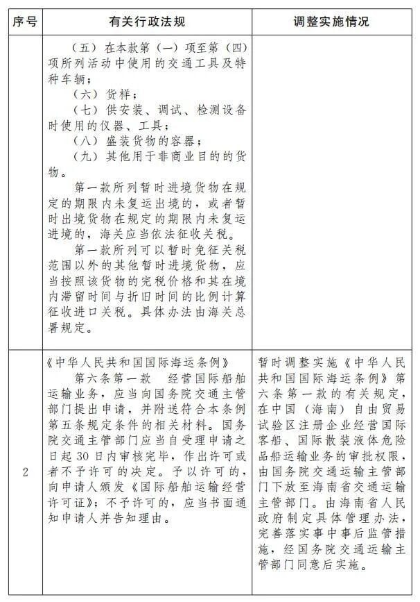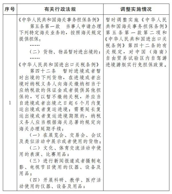国函〔2020〕88号 各省、自治区、直辖市人民政府,国务院各部委、各直属机构: 为支持海南全面深化改革开放,推动中国(海南)自由贸易试验区试点政策落地,国务院决定,即日起至2024年12月31日,在中国(海南)自由贸易试验区暂时调整实施《中华人民共和国海关事务担保条例》、《中华人民共和国进出口关税条例》、《中华人民共和国国际海运条例》、《中华人民共和国船舶和海上设施检验条例》和《国内水路运输管理条例》5部行政法规的有关规定(目录附后)。 国务院有关部门、海南省人民政府要根据上述调整,及时对本部门、本省制定的规章和规范性文件作相应调整,建立与试点要求相适应的管理制度。 根据中国(海南)自由贸易试验区改革开放措施的试验情况,本通知内容适时进行调整。 附件:国务院决定在中国(海南)自由贸易试验区暂时调整实施有关行政法规规定目录 国务院 2020年6月18日 (此件公开发布) 附件 国务院决定在中国(海南)自由贸易试验区暂时调整实施有关行政法规规定目录