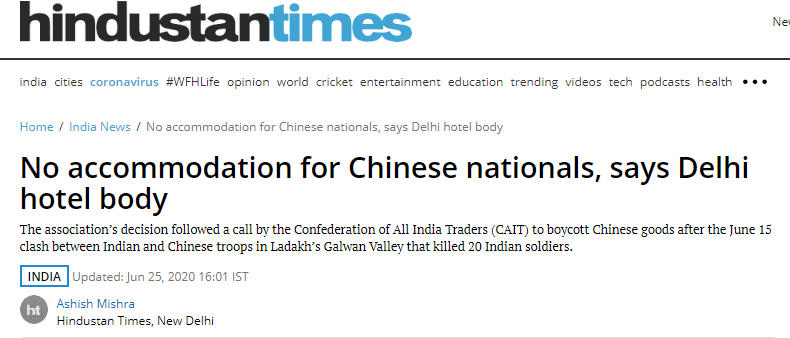 据印度媒体报道,印度首都新德里的一个酒店和餐馆行业组织于本周四表示,该组织旗下的3000家酒店将不会再给任何中国公民提供住宿服务。根据《印度斯坦时报》的报道,做出这一决定的行业组织名为“德里酒店和餐馆所有者协会”,该组织是在印度另一个名为“全印度贸易者邦联”的贸易行会发出了抵制中国货的呼吁后,做出的这一抵制中国人的决定的。该组织的秘书长就称,他们这么做是因为在6月15日的中印边境冲突后,当地很多酒店经营者对于“中国对待印度的方式”很“愤怒”,所以在“全印度贸易者邦联”决定抵制中国货后,这些酒店经营者也决定参与其中,不仅不再让其旗下的酒店购买任何中国产品,也不会再给中国人提供客房服务。《印度斯坦时报》介绍说,这个印度首都的酒店和餐馆行业组织宣称他们在新德里拥有3000家酒店和总共7.5万个客房,这些酒店基本上都是廉价酒店。不过,《印度斯坦时报》也指出,受到新冠肺炎疫情的影响,印度首都的很多酒店本身也没有开业。值得一提的是,印度也并不是中国庞大的出境游客群体的主要旅游目的地。中国的《澎湃新闻》在2018年的一篇报道中提到,一组来自印度国家旅游部的数据显示,虽然中国在2017年时有超过1.3亿人次的出境游游客,但其中仅有25万人次来到了印度。