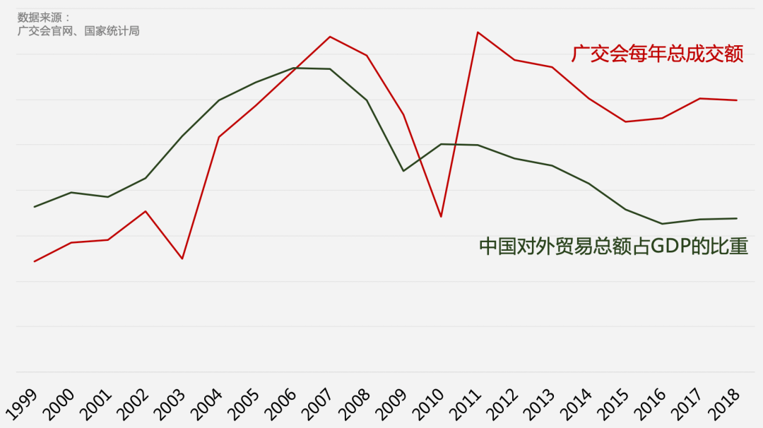 不过,自2012年以后,外贸在GDP上的比重日益下降,消费取代其成为拉动GDP增长的主要马车,广交会也日渐式微。