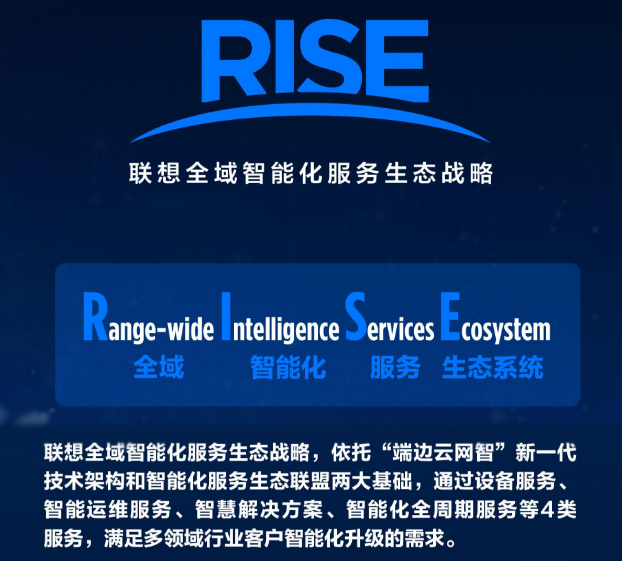 2017年起,联想中国区就开始启动一项名为“日出东方”的战略,致力于成为中国智能变革的推动者和赋能者。今年,他们则同全球的合作伙伴一起,打造了一个名为RISE的全域智能化服务生态战略,在智慧城市、智慧教育、智慧农业、智慧能源、智慧商务、智能制造等多领域提供智能化解决方案。