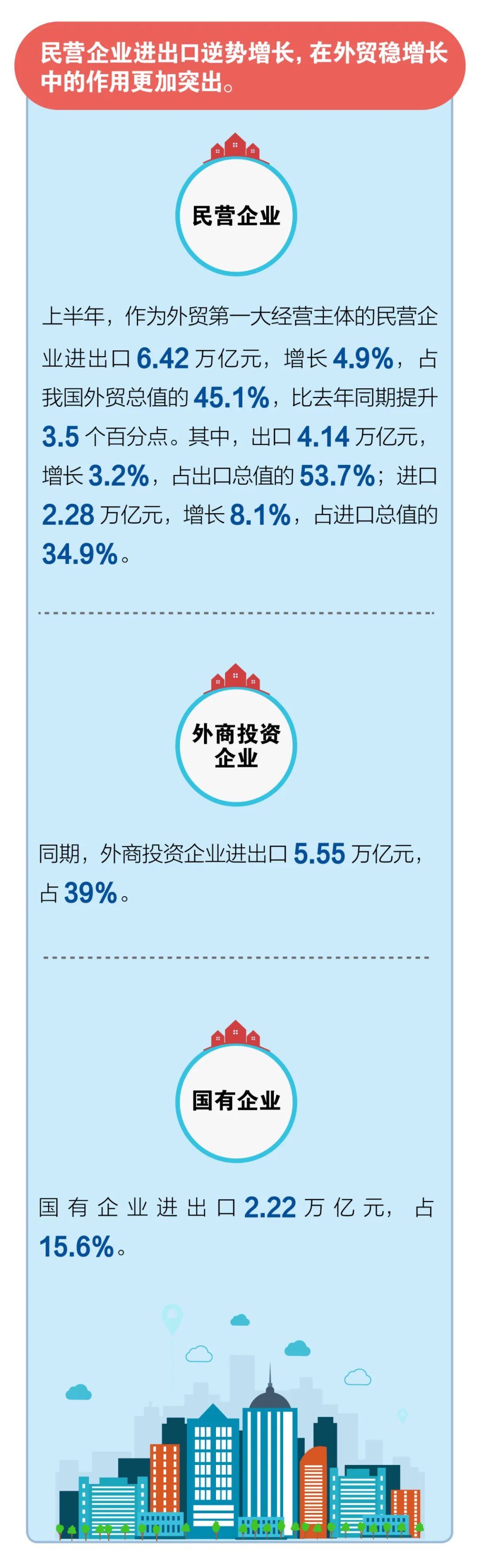 上半年,作为外贸第一大经营主体的民营企业进出口6.42万亿元,增长4.9%,占我国外贸总值的45.1%,比去年同期提升3.5个百分点。其中,出口4.14万亿元,增长3.2%,占出口总值的53.7%;进口2.28万亿元,增长8.1%,占进口总值的34.9%。同期,外商投资企业进出口5.55万亿元,占39%。国有企业进出口2.22万亿元,占比15.6%。