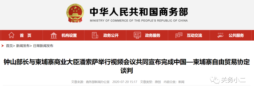 7月20日,商务部部长钟山与柬埔寨商业大臣潘索萨举行视频会议,共同宣布完成中国―柬埔寨自由贸易协定谈判,并就加强两国抗疫合作、深化双边经贸关系等议题深入交换意见。商务部副部长兼国际贸易谈判副代表王受文参加会议。