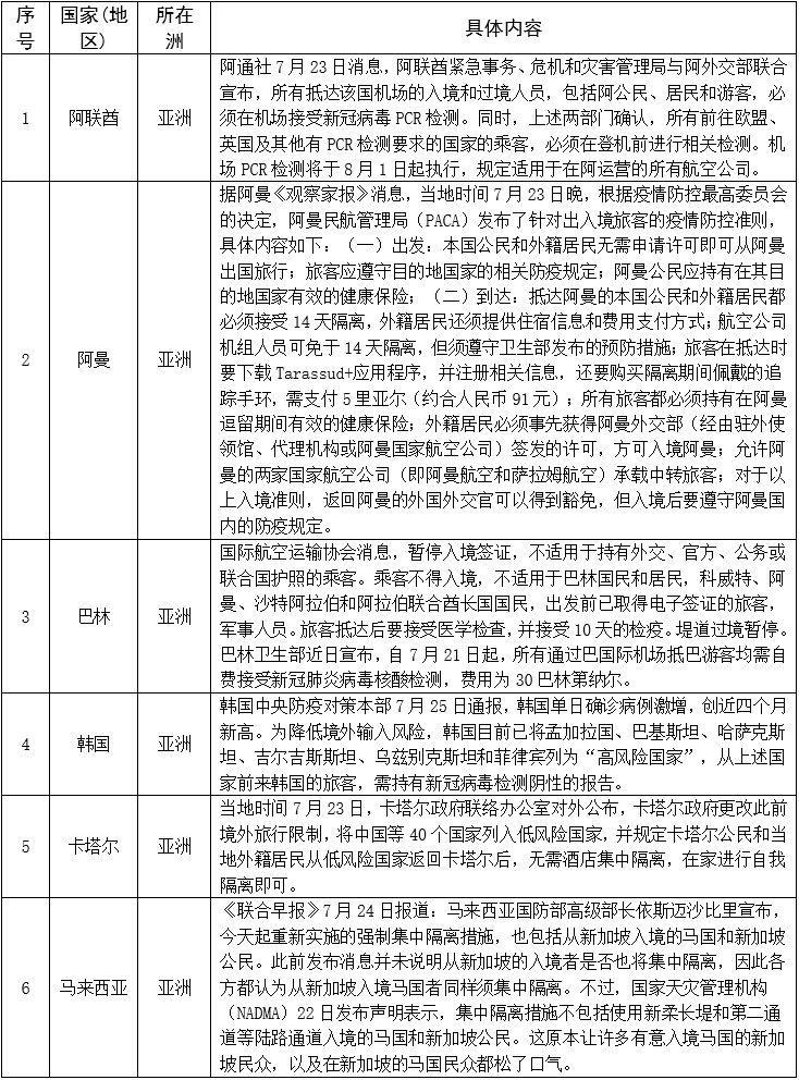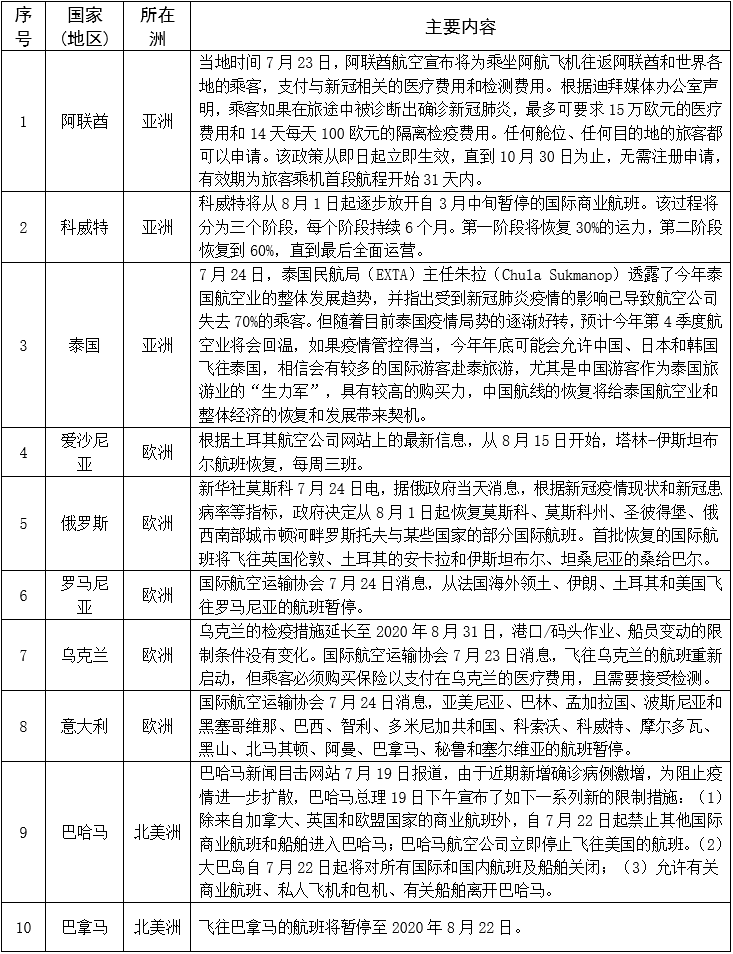 对船舶/航班/列车采取措施的情况——截至7月27日,共有156个国家(地区)采取了相关措施。本期更新25个国家(地区),其中阿联酋航空为乘坐阿航飞机往返阿联酋和世界各地的乘客,支付与新冠相关的医疗费用和检测费用;科威特、爱沙尼亚、俄罗斯、乌克兰、哥斯达黎加、埃及、苏丹重启部分航班。具体如下: