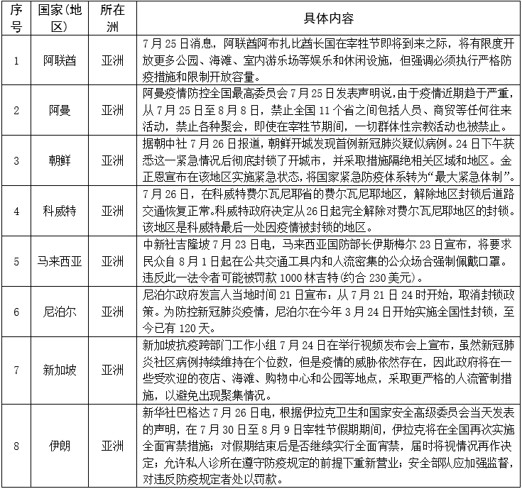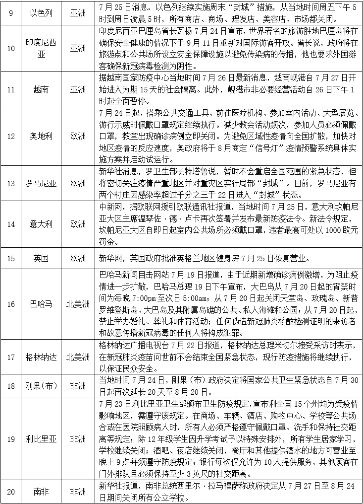 宣布进入紧急状态等情况的国家(地区)——截至7月27日,共有163个国家(地区)采取了相关措施。本期更新20个国家(地区),其中阿联酋、科威特、印度尼西亚、英国放松部分管控措施;尼泊尔取消全国性封锁。具体情况如下: