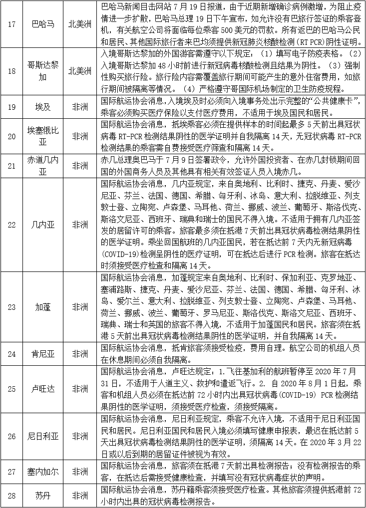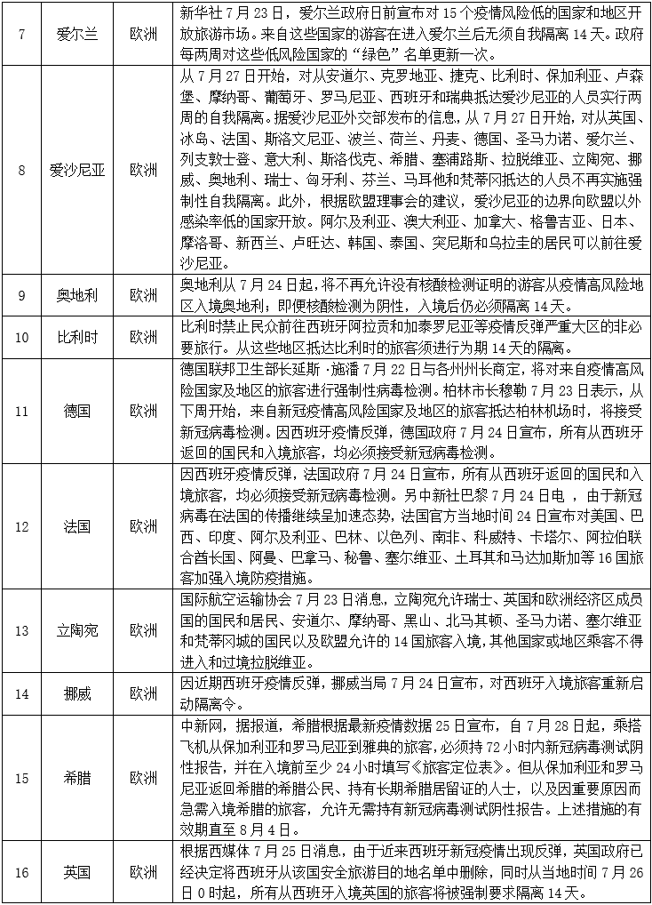 对人员入境采取措施的情况——截至7月27日,共有179个国家(地区)采取了相关措施。本期更新31个国家(地区),其中爱尔兰政府宣布对15个疫情风险低的国家和地区开放旅游市场,来自这些国家的游客在进入爱尔兰后无须自我隔离14天;爱沙尼亚对部分欧洲国家入境人员取消强制隔离,允许欧盟以外感染率低的国家居民入境;立陶宛、赤道几内亚允许部分符合条件人员入境。具体如下: