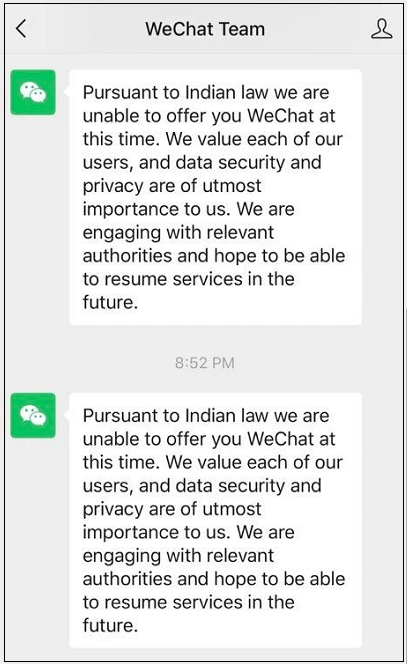 微信在给用户的通知中称,“根据印度法律,我们目前无法为您提供微信服务。我们重视每一位用户,数据安全和隐私对我们来说是最重要的。我们正在与相关部门接触,希望未来能够恢复服务。”
