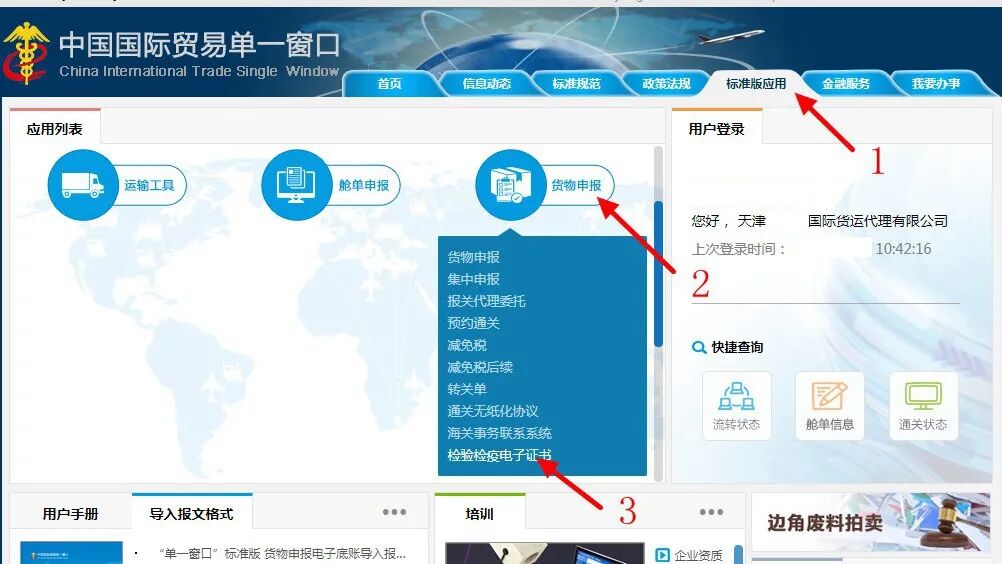 登陆“单一窗口”后,先后点击“标准版应用”、“货物申报”、“检验检疫电子证书”。