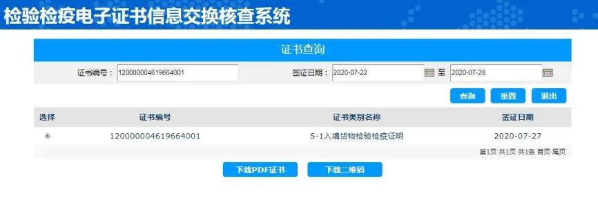 进入“检验检疫电子证书信息交换核查系统”后将显示如下的初始界面。可显示某一区间内海关签发的电子《证明》。