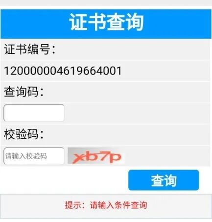 扫描二维码将出现“证书查询”界面,输入之前收到的“查询码”以及“校验码”后将可查询证书状态并下载一份PDF版电子《证明》。