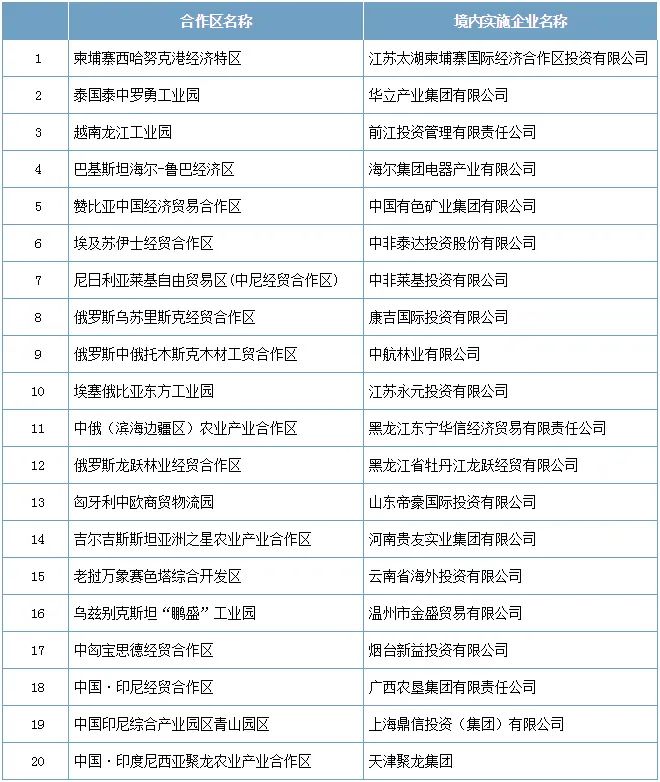 以通过商务部和财政部确认考核的20家境外经贸合作区为例,中方投资者包括以下几种: