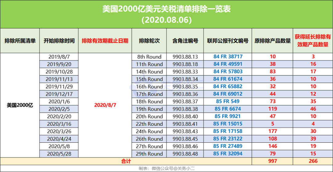 2020年8月6日美国对2000亿关税排除有效期延长情况: