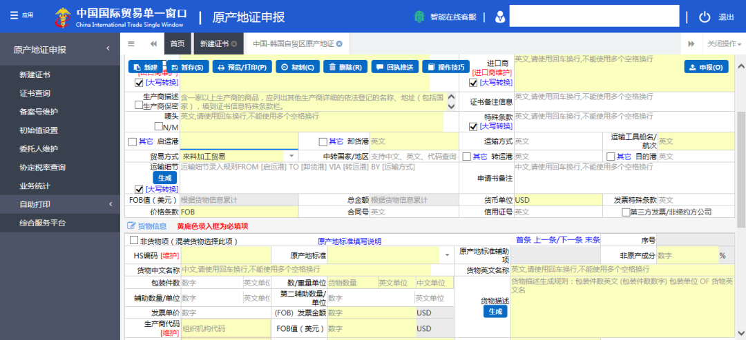 2、进口成分比例,货物生产商名称、组织机构代码、联系人、联系电话设为必填项;此外,ECFA证书英文名称设为非必填项,出口商、进口商、生产商名称地址、电话、传真、邮箱均设为必填项,电话、传真、邮箱如无的,提示企业填写“无”;