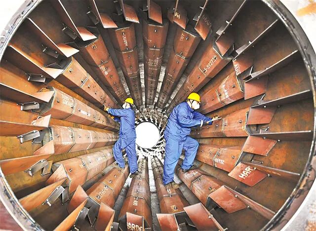近年来,永清县通过政策引导、资金扶持、人才引进等方式鼓励企业进行科技创新,助推企业高质量发展。这是在廊坊德基机械科技有限公司生产车间,工人在检查沥青混凝土搅拌站核心部件干燥筒内的焊点。通讯员张玉宇摄