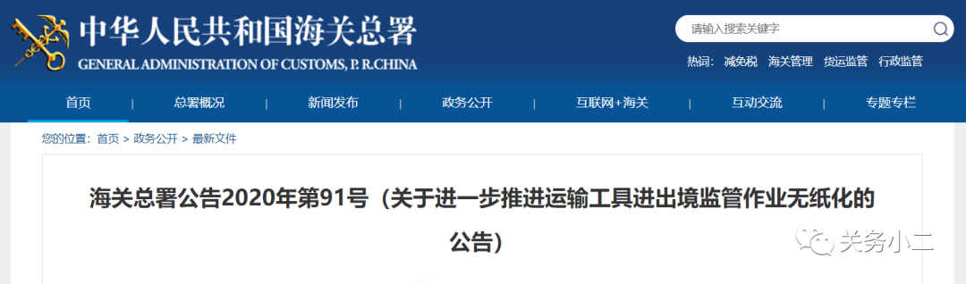 海关总署公告2020年第91号(关于进一步推进运输工具进出境监管作业无纸化的公告)