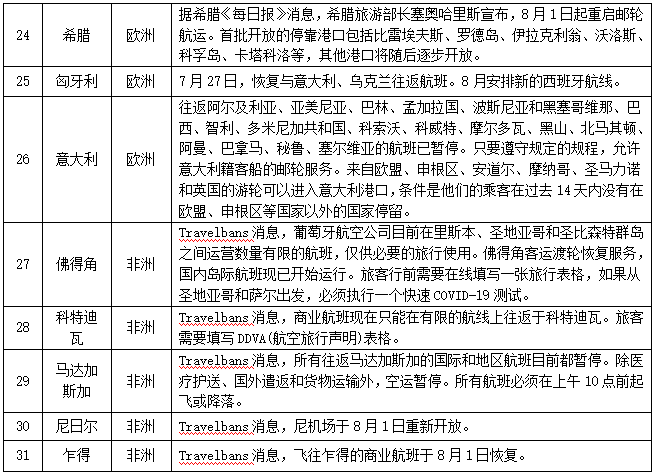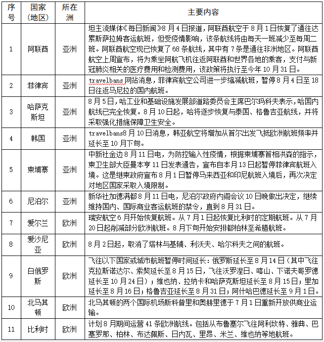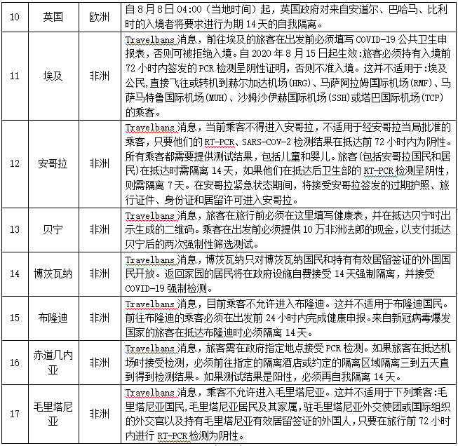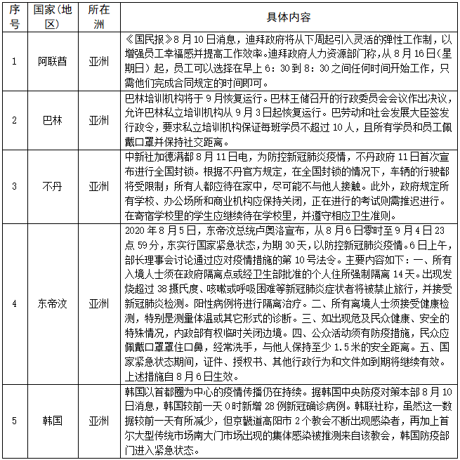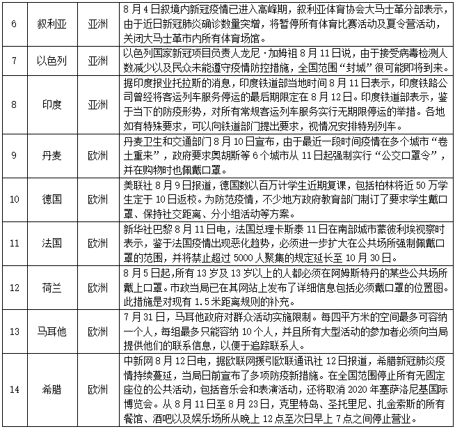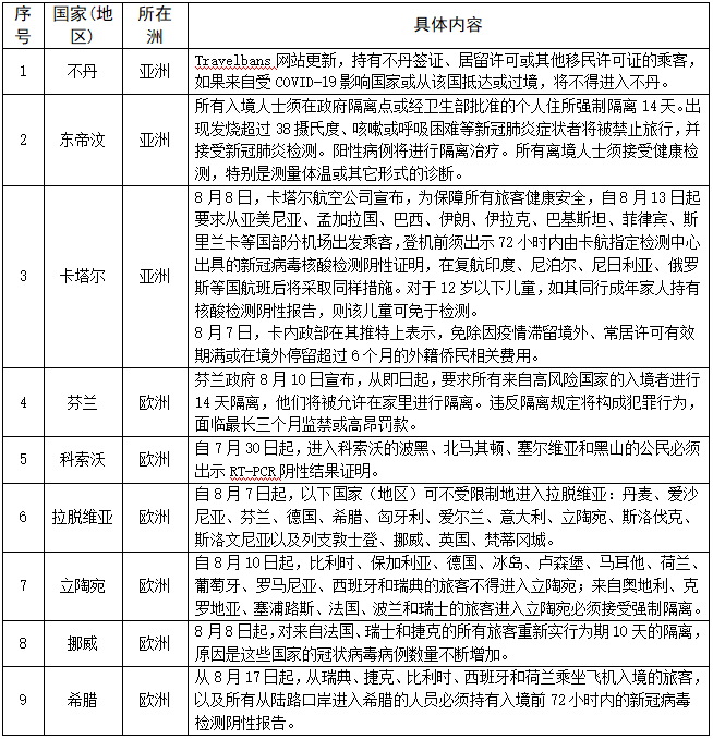 对人员入境采取措施的情况——截至8月12日,共有183个国家(地区)采取了相关措施。本期更新20个国家(地区),其中拉脱维亚允许部分欧洲国家(地区)人员入境,多数国家加强入境管控措施。具体如下: