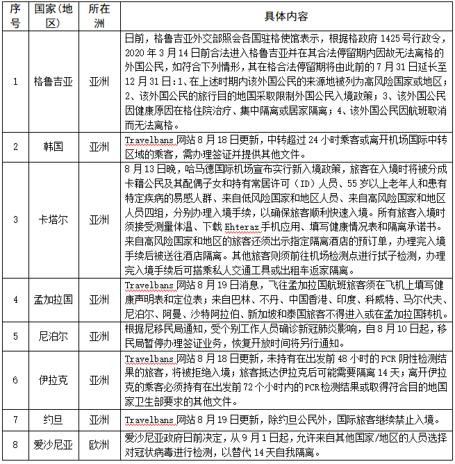 对人员入境采取措施的情况——截至8月19日,共有185个国家(地区)采取了相关措施。本期更新14个国家(地区),其中格鲁吉亚延长符合条件的外国公民的合法停留期;爱沙尼亚允许入境人员选择病毒检测以代替隔离;赴俄罗斯远东旅游的外国人可凭电子签证在指定口岸入境。具体如下: