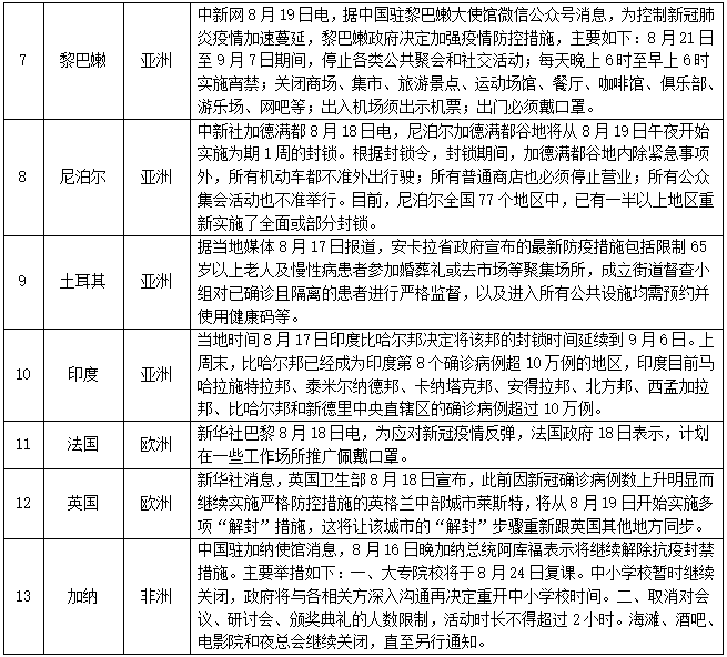 宣布进入紧急状态等情况的国家(地区)——截至8月19日,共有164个国家(地区)采取了相关措施。本期更新13个国家(地区),其中阿联酋、阿曼、巴林、菲律宾、英国、加纳不同程度地放松部分管控措施。具体情况如下: