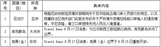对边境口岸采取措施的情况——截至8月19日,有107个国家(地区)采取了相关措施。本期更新3个国家(地区),其中刚果(金)重新开放边界。具体情况如下: