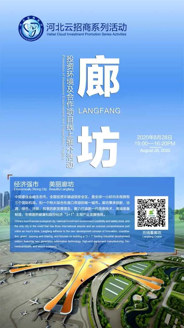 为贯彻落实省主要领导关于“5·18”廊坊经洽会打造永不落幕网上洽谈会的指示精神,省商务厅计划举办“云招商”系列活动,打造永不落幕河北网上投洽会。按照《河北省云招商系列活动工作方案》安排,8月28日将举办“廊坊专场推介会”,届时重点推介廊坊市投资环境与外资合作项目,为做好相关工作,特制订本方案。具体如下: