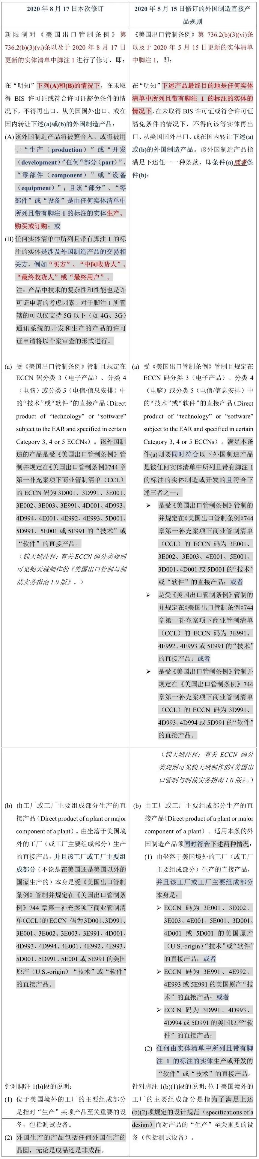根据本次修订:任何方生产/开发的零部件/设备中含有上述相应ECCN码的技术/软件的直接产品,或者任何方在生产零部件/设备时,其境外工厂/或工厂主要组成部分是由上述相应ECCN码的技术/软件的直接产品构成,则只要该零部件/设备被用于实体清单中所列且带有脚注1的标注的实体(即:通常而言是被列入实体清单的华为公司)的生产/开发,或者被列入实体清单的华为公司购买或订购,甚至在交易中是“买方”/“中间收货人”/“最终收货人”/“最终用户”,则其与该等华为公司的交易需要根据美国《出口管制条例》事先向BIS申请贸易许可。