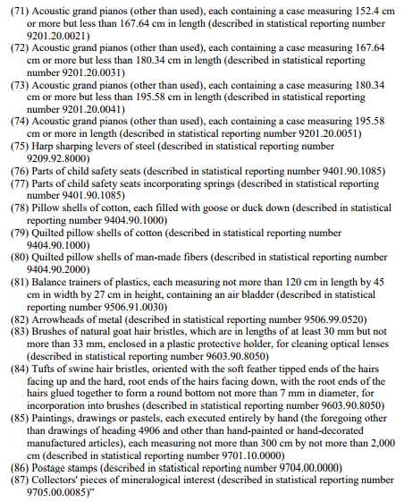 此次没有在排除名单内商品共涉及81个税号下128个品项的商品,9月1日起恢复加征7.5%关税,名单如下: