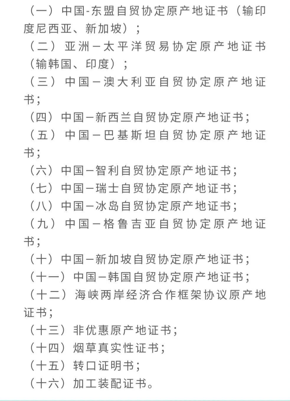 目前支持自助打印的证书共有16种,既包括非优惠原产地证书,也基本涵盖常用的自由贸易协定原产地证书。