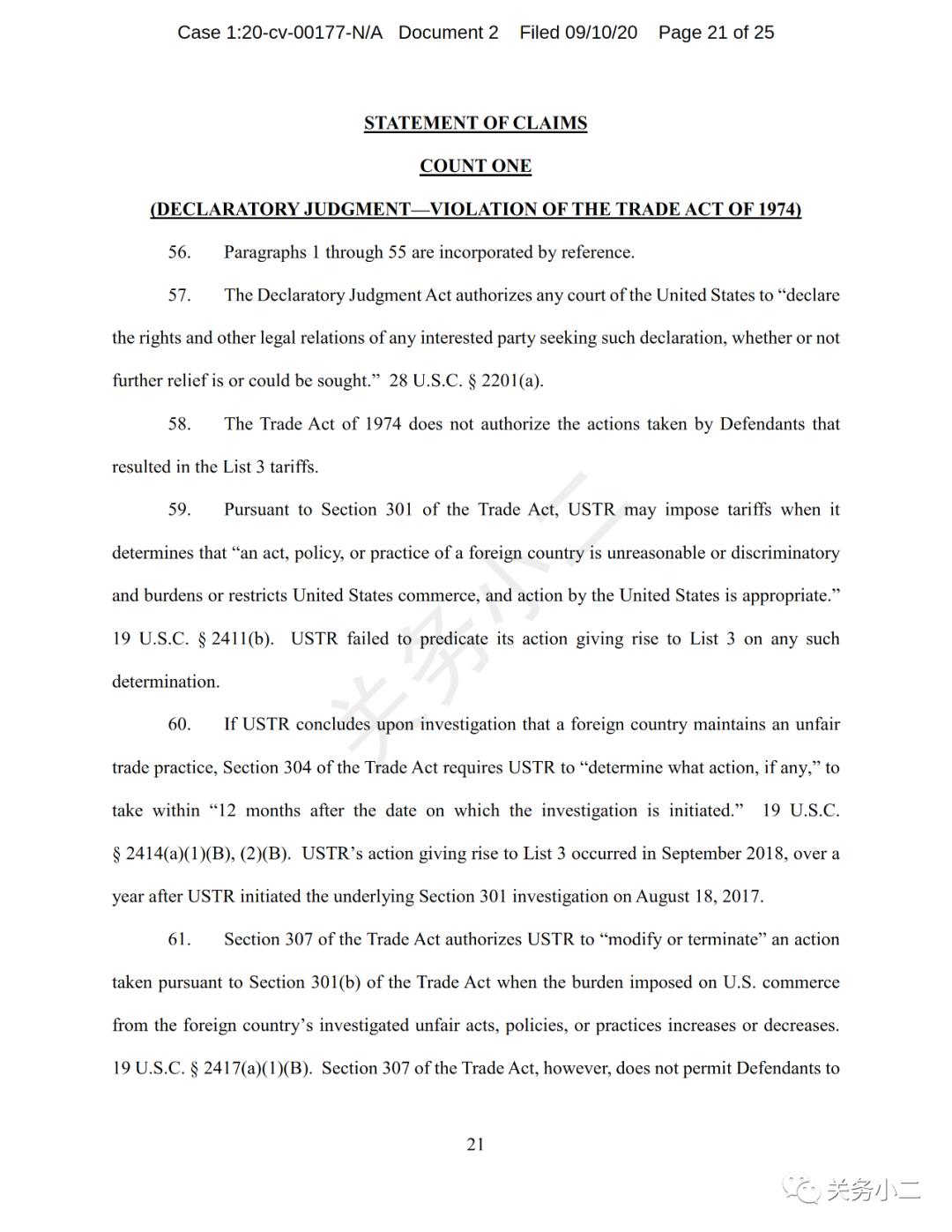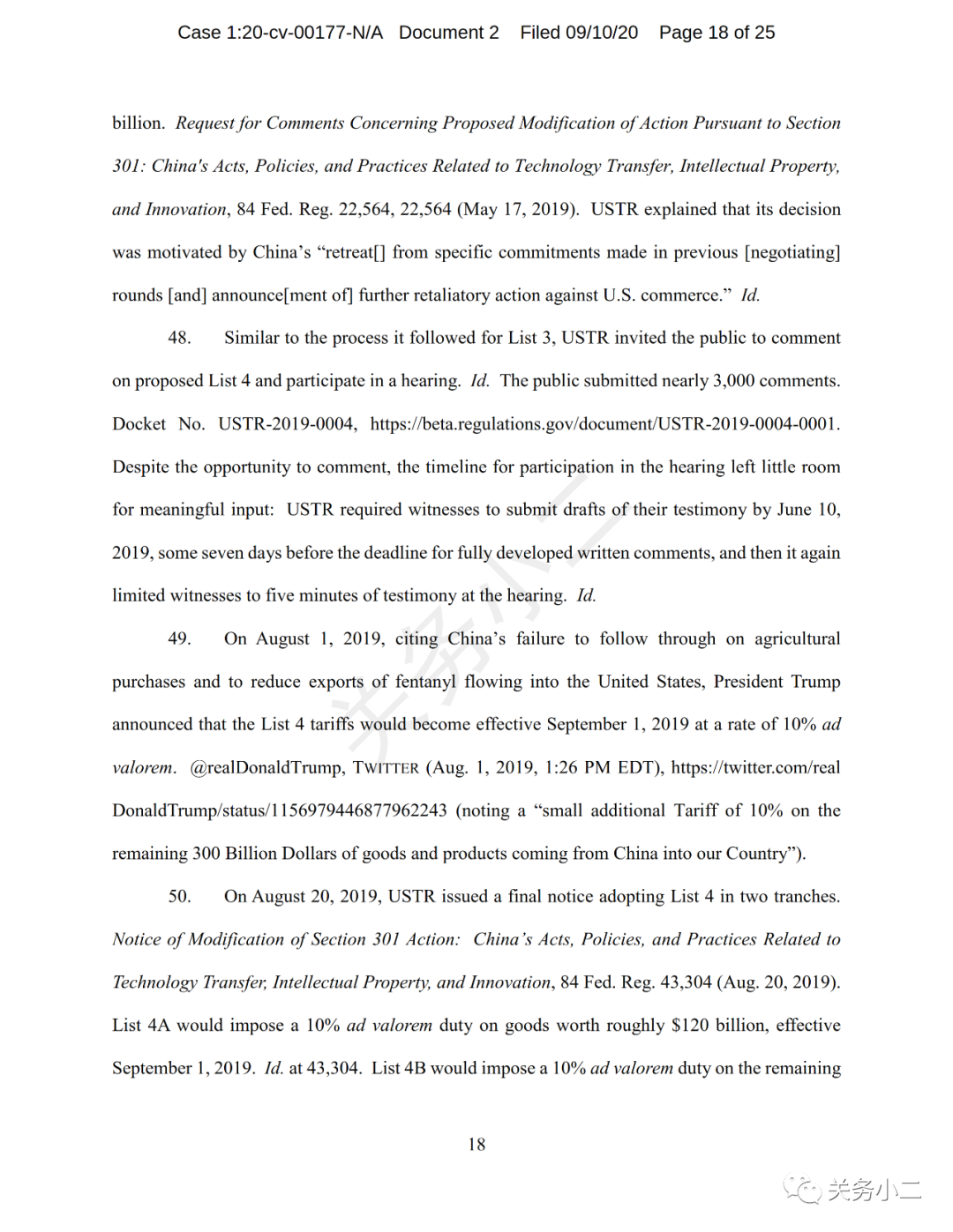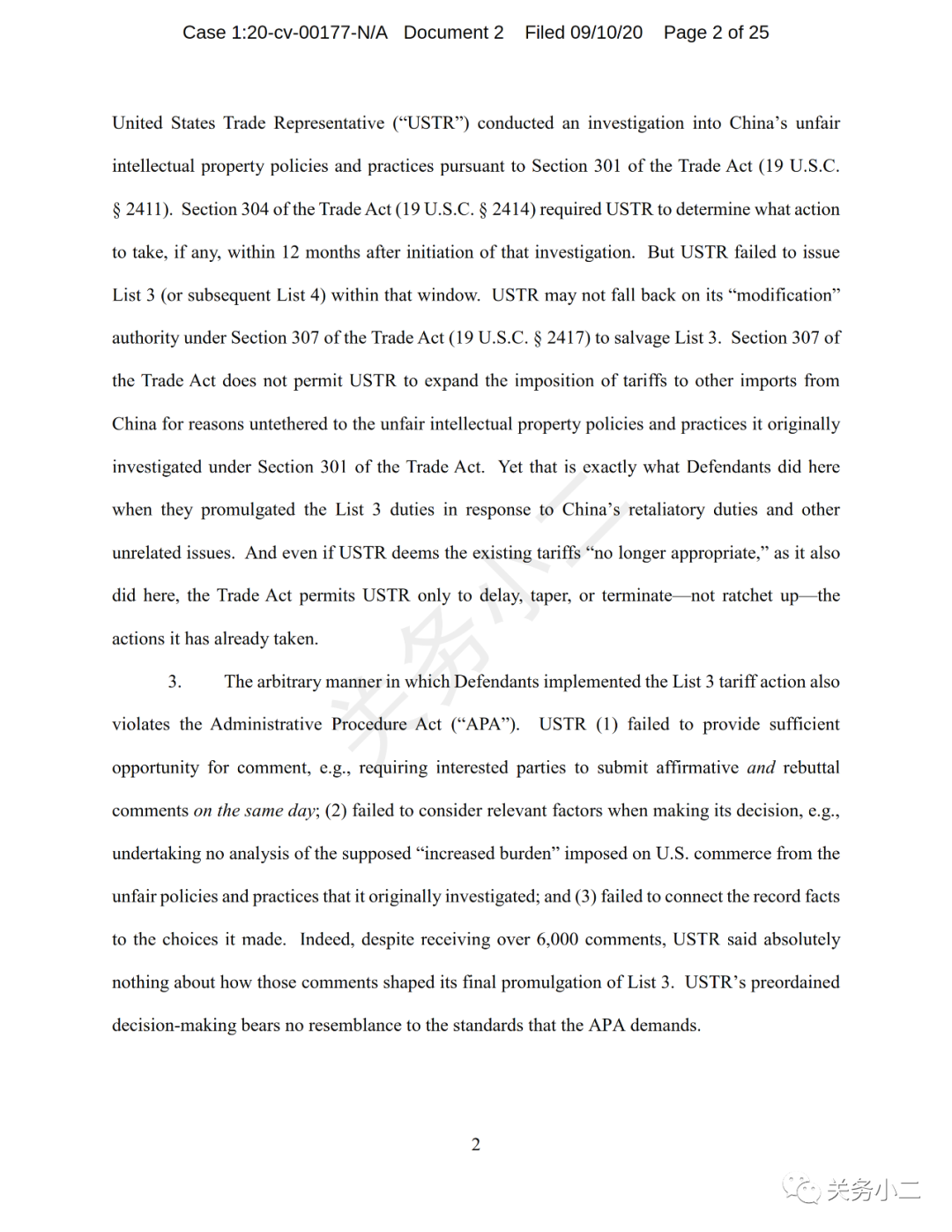申诉称,USTR的清单3和4A关税制度违反了美国1974年的贸易法,该公司认为USTR是为了对中国实施报复而进行报复,这与侵犯知识产权的原始原因无关。要求追溯并退还清单3和4A已支付的所有加征关税。