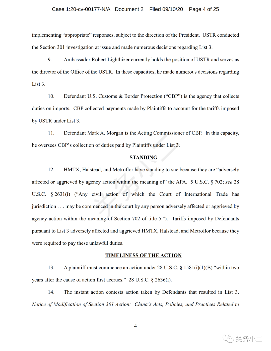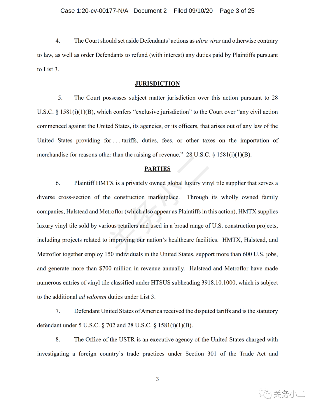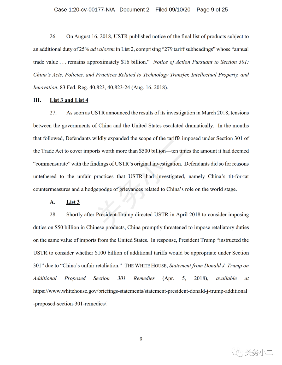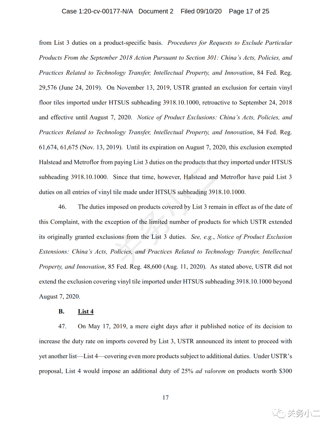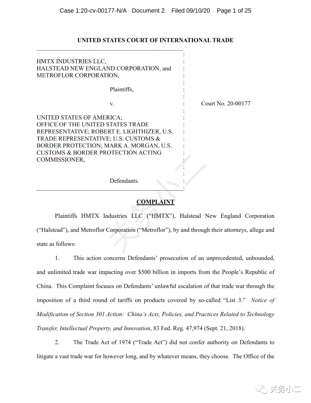 2020年9月10日,美国进口商(HMTX Industries LLC)在国际贸易法院(CIT)向美国贸易代表办公室(USTR)和美国海关(CBP)提起了诉讼,质疑USTR在301关税措施中针对中国商品采取的行动,尤其是加征关税清单3和4A(即美国2000亿和3000亿加征关税清单),已超过其职权范围。