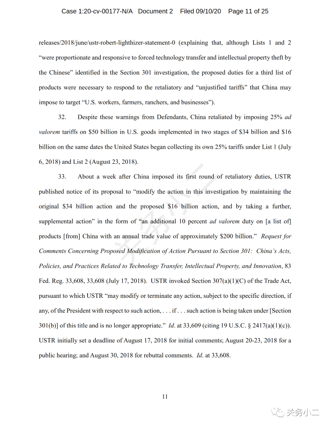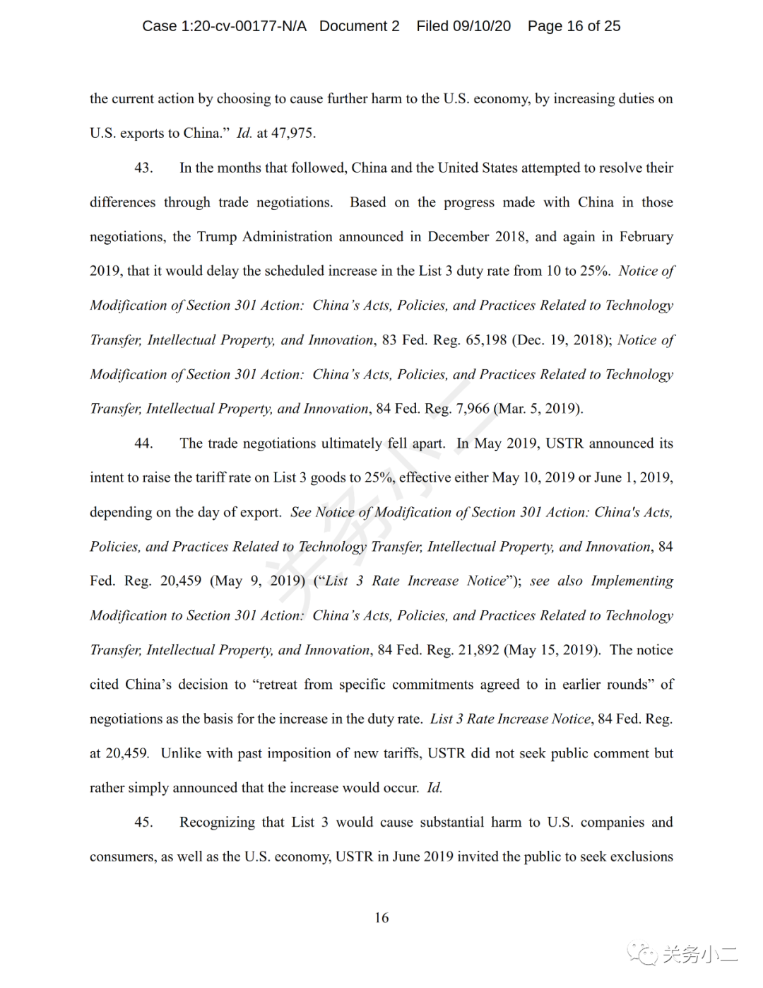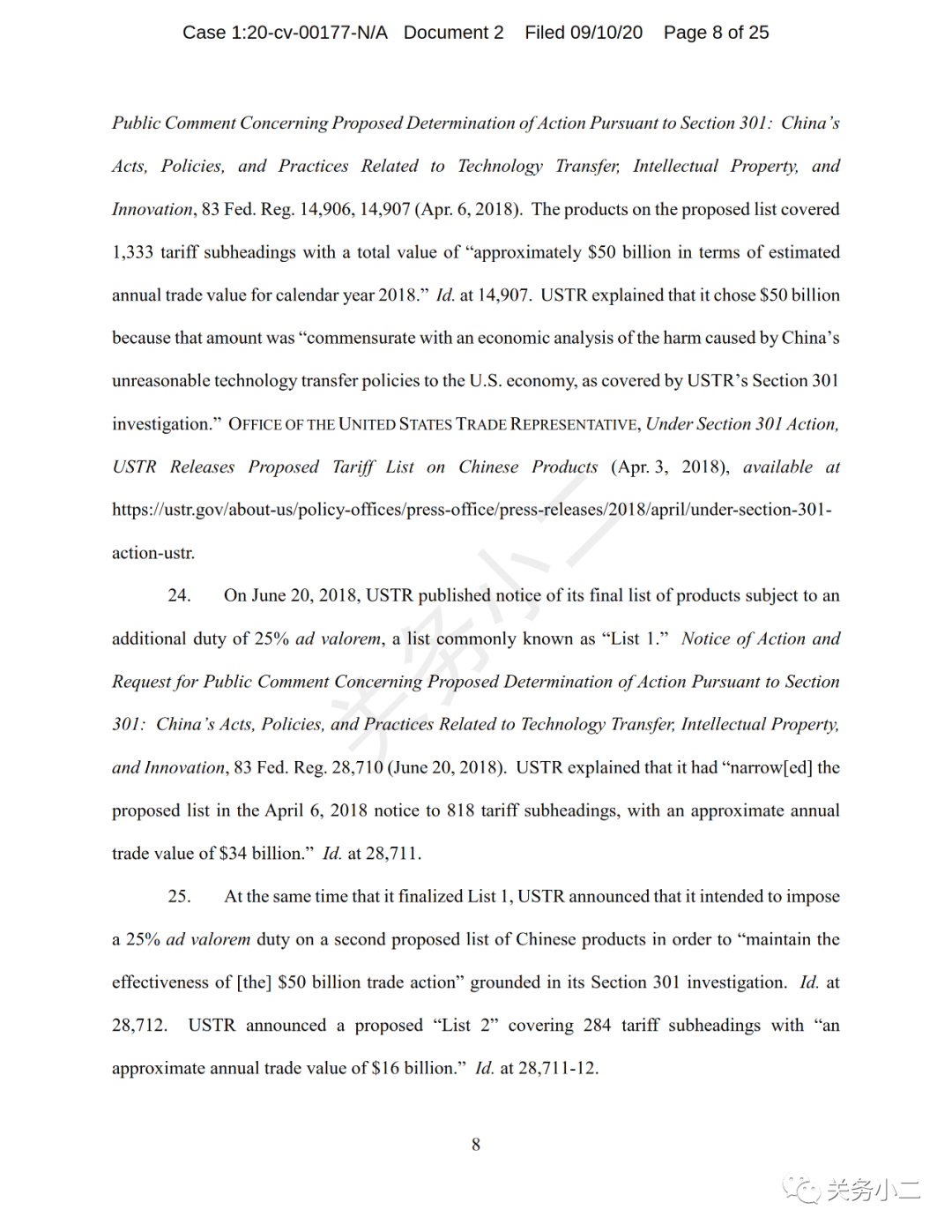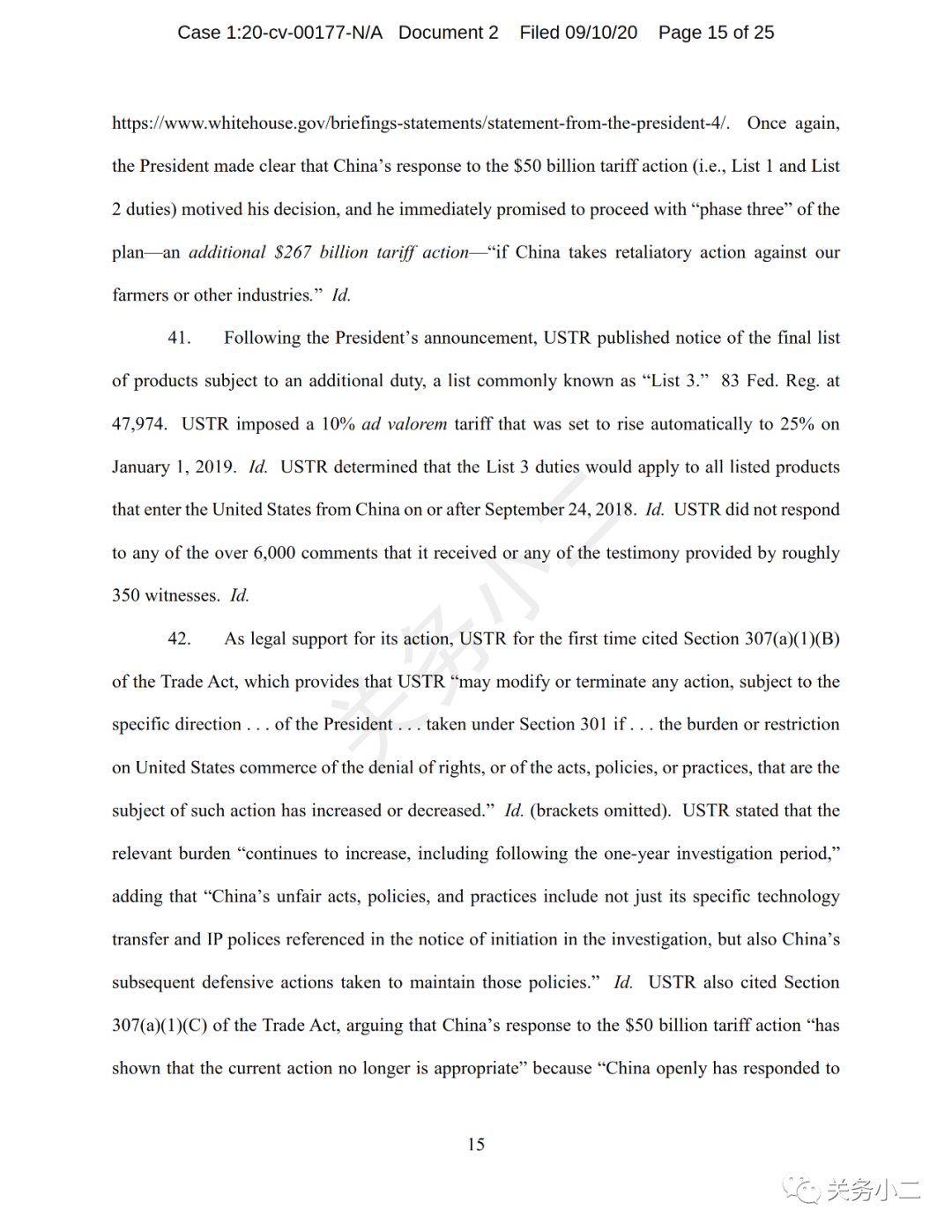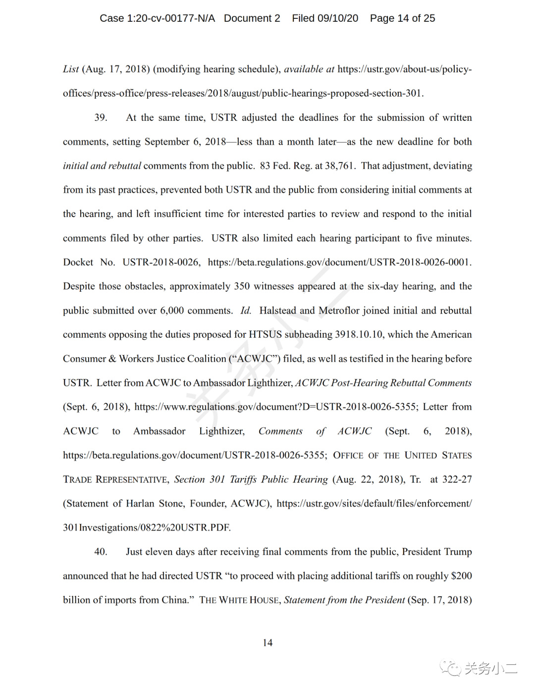 2020年9月10日,美国进口商(HMTX Industries LLC)在国际贸易法院(CIT)向美国贸易代表办公室(USTR)和美国海关(CBP)提起了诉讼,质疑USTR在301关税措施中针对中国商品采取的行动,尤其是加征关税清单3和4A(即美国2000亿和3000亿加征关税清单),已超过其职权范围。