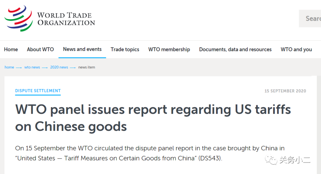 2020年9月15日,世界贸易组织争端解决机构专家组就中国诉美301关税措施世贸争端案发布专家组报告,认定美国涉案的加征征税措施违反世贸组织义务。