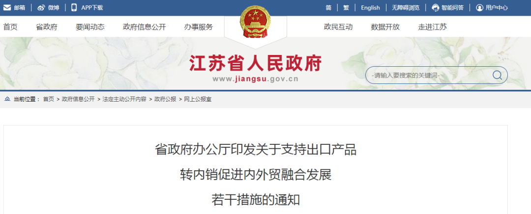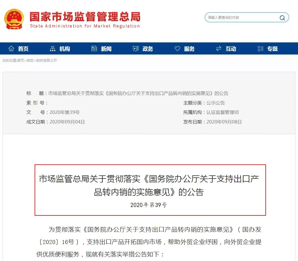 近日,国家市场监管总局官网发布《国务院办公厅关于支持出口产品转内销的实施意见》,明确提出:支持出口产品开拓国内市场,帮助外贸企业纾困,向外贸企业提供优质便利服务。