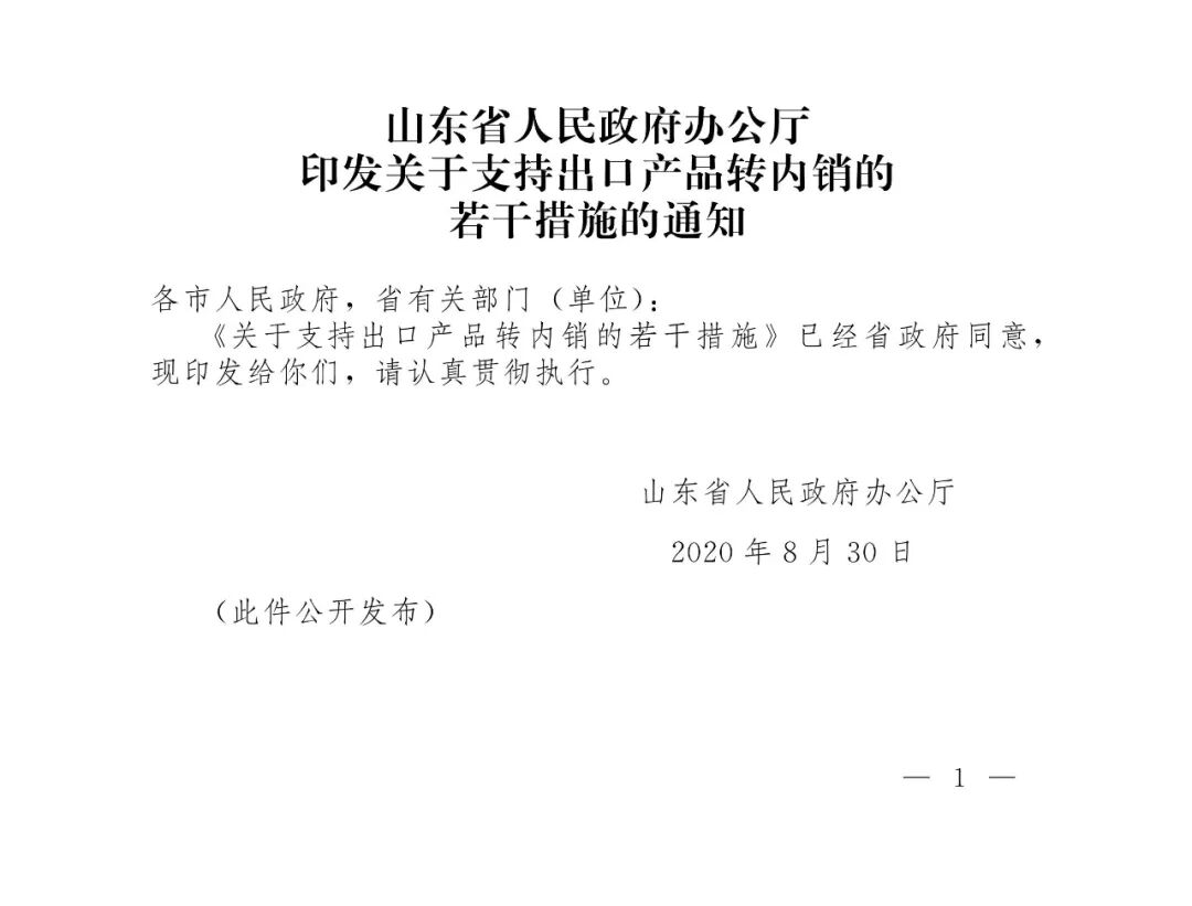 为认真贯彻落实《国务院办公厅关于支持出口产品转内销的实施意见》(国办发〔2020〕16号)等文件要求,统筹推进新冠肺炎疫情防控和经济社会发展,进一步做好“六稳”工作、落实“六保”任务。8月30日,山东省人民政府办公厅印发《关于支持出口产品转内销的若干措施》的通知。
