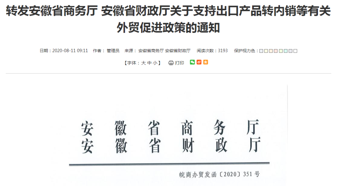 7月份,安徽省商务厅、安徽省财政厅联合出台《关于支持出口产品转内销等有关外贸促进政策的通知》。鼓励企业在拓展国际市场的同时,积极推动外贸企业出口产品转内销;加快形成以国内大循环为主体、国内国际双循环相互促进的新发展格局,做好“六稳”工作。