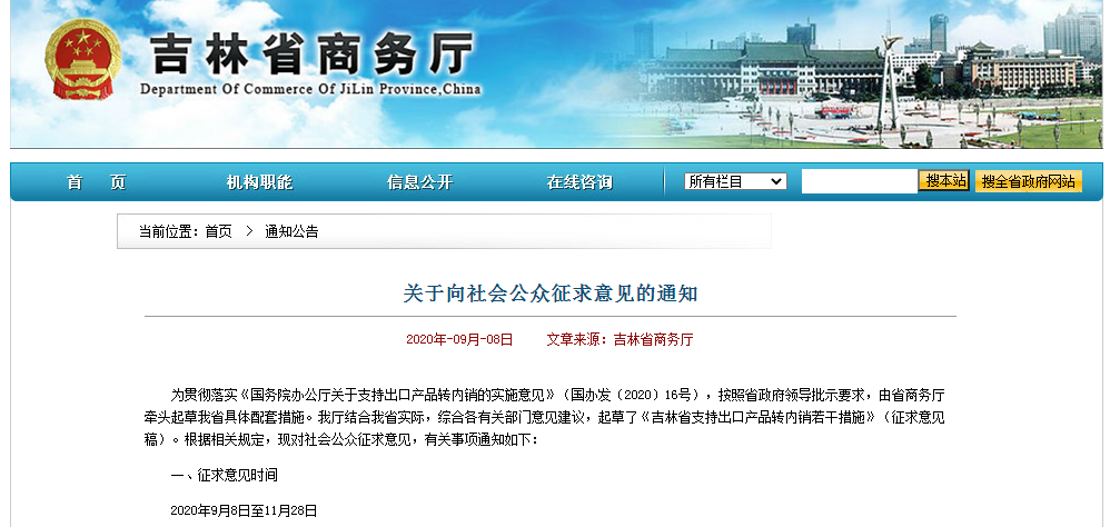 为贯彻落实《国务院办公厅关于支持出口产品转内销的实施意见》(国办发〔2020〕16号),按照省政府领导批示要求,由吉林省商务厅牵头起草我省具体配套措施。9月8日,我厅结合我省实际,综合各有关部门意见建议,起草了《吉林省支持出口产品转内销若干措施》(征求意见稿)。