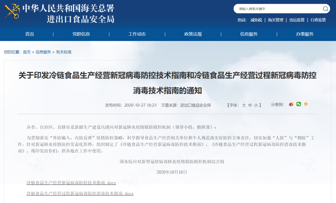 10月26日,国务院联防联控机制发布了两份技术指南,提出建立冷链食品生产经营企业员工健康登记制度和健康异常报告程序,并要求对来自新冠肺炎疫情高风险地区(国家)的冷链食品外包装进行严格消毒。
