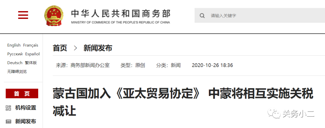 10月23日,《亚太贸易协定》(以下简称《协定》)秘书处通知各成员方,蒙古国已向亚太经社会交存接受书,完成《协定》加入程序,并拟于2021年1月1日与有关成员相互实施关税减让安排。