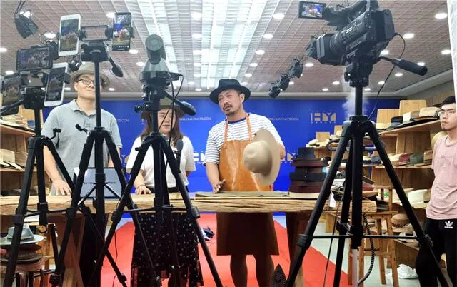 在今年举办的首届网上广交会上,华艺帽业的工作人员正在进行直播带货。受访者供图