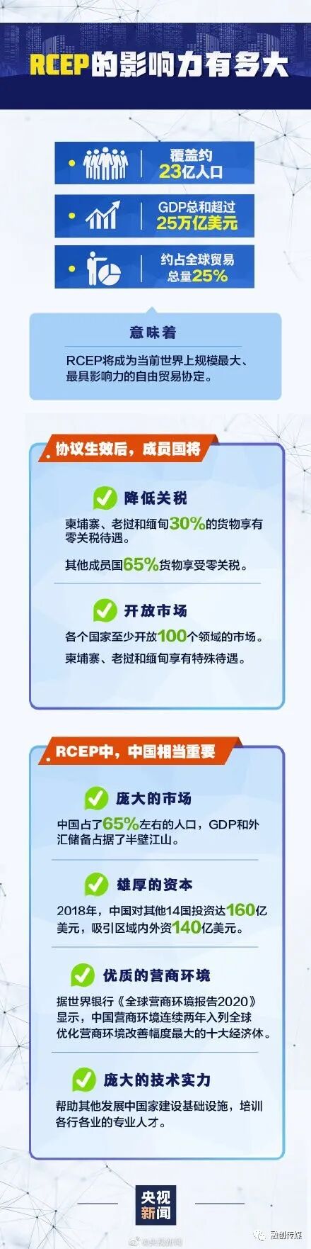 整体而言,RCEP将使成员国的原材料成本、生产成本降低,商品价格下降,竞争力增强,同时也会加大刺激区域内部消费。