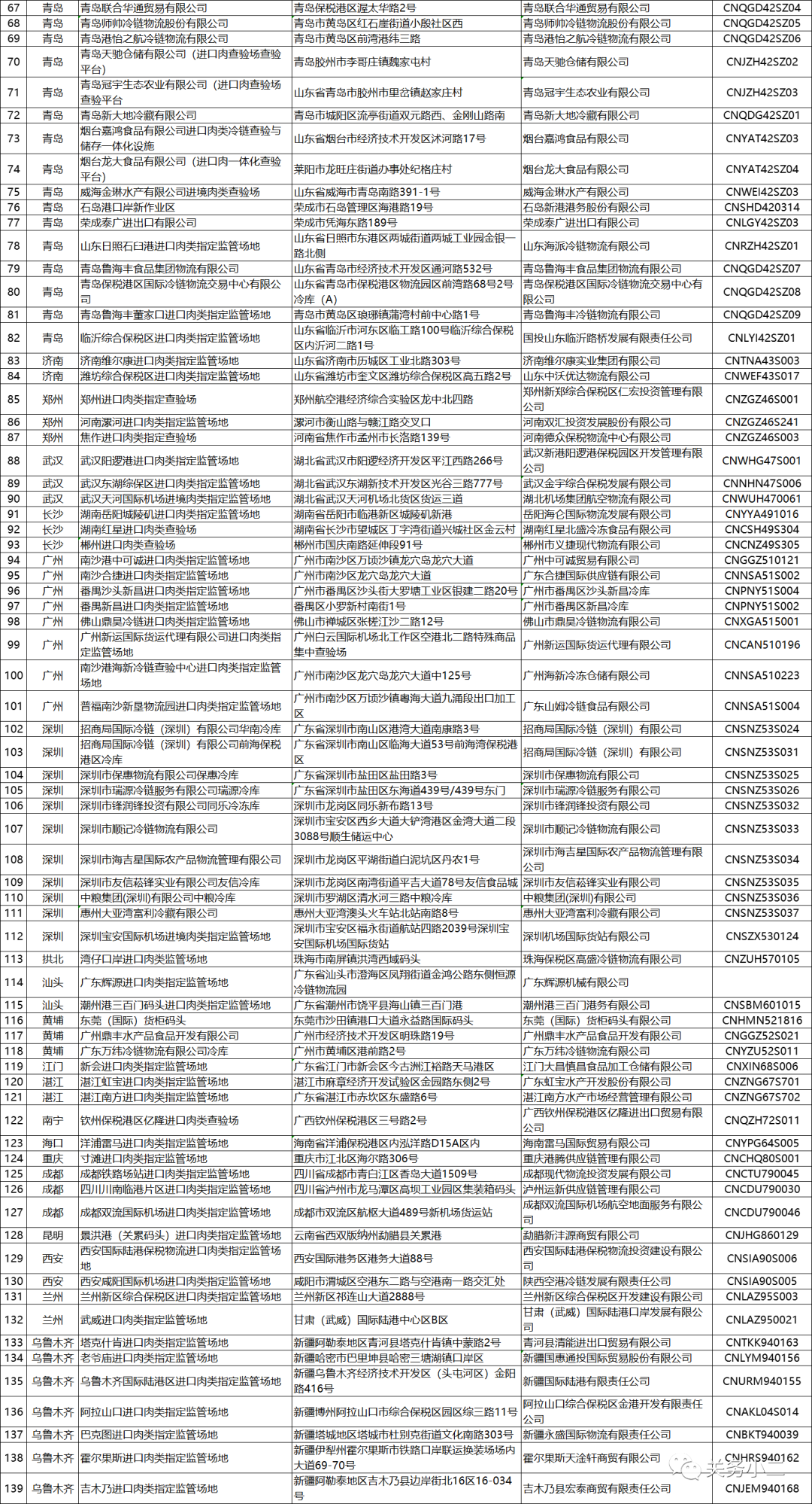 附进境肉类指定监管场地名单(2020年10月9日更新)