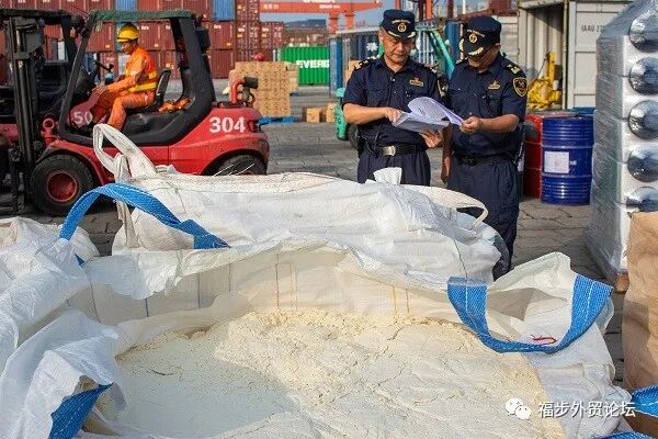 上图为厦门海关查获1977吨禁止进口类固体废物对苯二甲酸